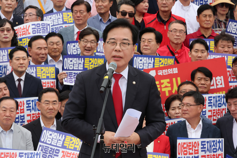 송언석 국민의힘 원내대표가 12일 국회 본청 앞 계단에서 열린 '야당탄압 독재정치 규탄대회'에서 발언을 하고 있다.