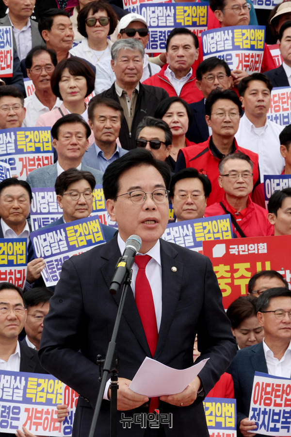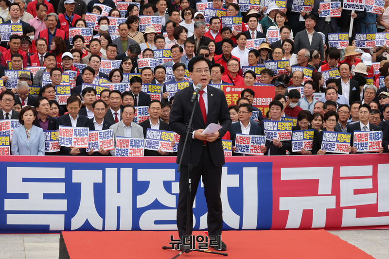[포토] '야당탄압 독재정치 규탄대회'서 발언하는 송언석