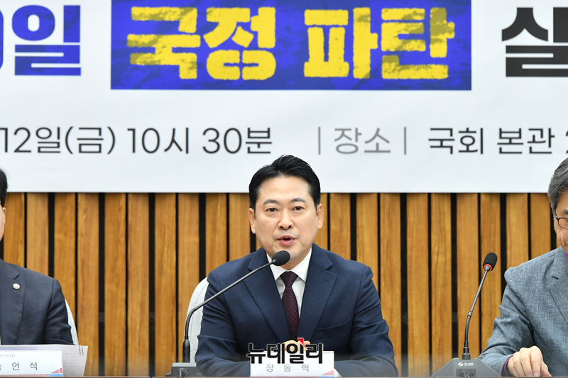 장동혁 국민의힘 대표가 12일 오전 국회에서 열린 '이재명 정부 100일 국정 파탄 실정 토론회'에서 발언을 하고 있다.