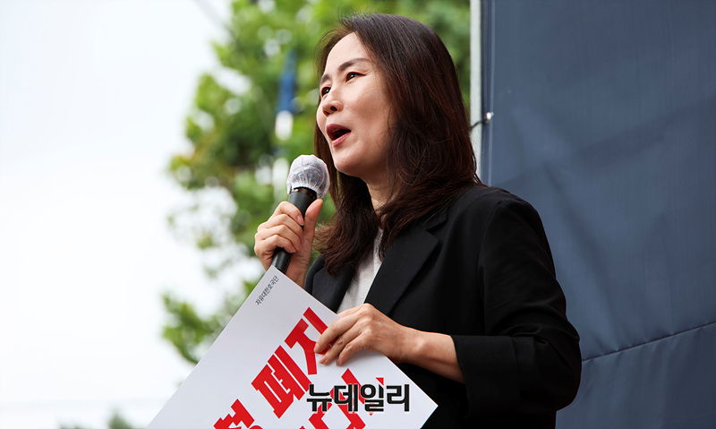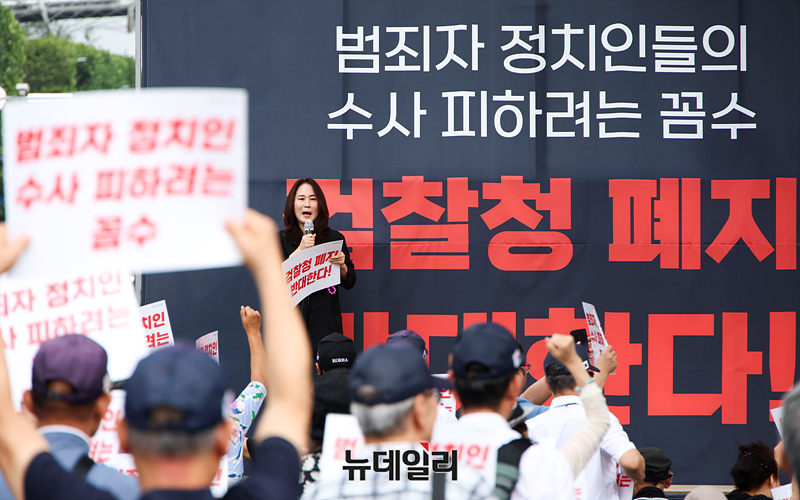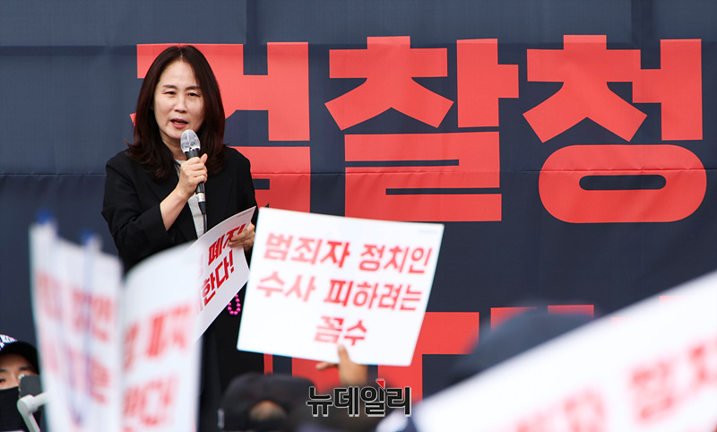 박소영 교육바로세우기운동본부 대표가 16일 오전 서울 서초구 대검찰청 앞에서 열린 범죄자 정치인들의 위헌적 검찰청 폐지 반대 집회에서 발언하고 있다.
