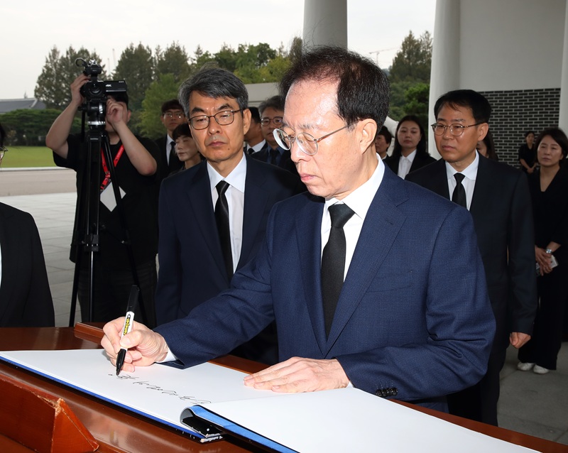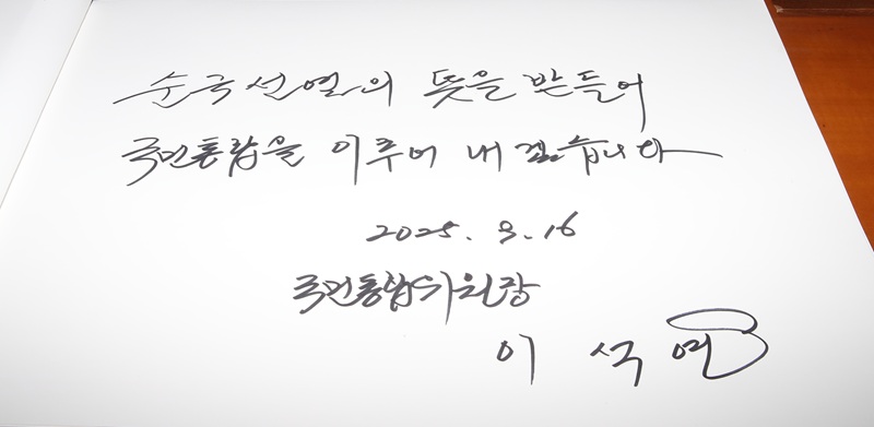 국민통합위원회 직원들과 함께 참배를 마친 이 위원장은 방명록에 "순국선열의 헌신을 기리며, 국민통합을 이루어 내겠습니다"라고 남겼다.