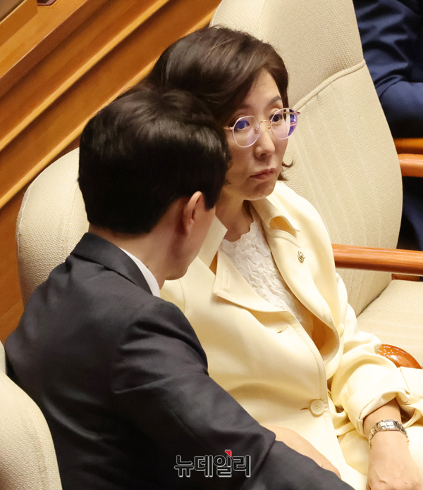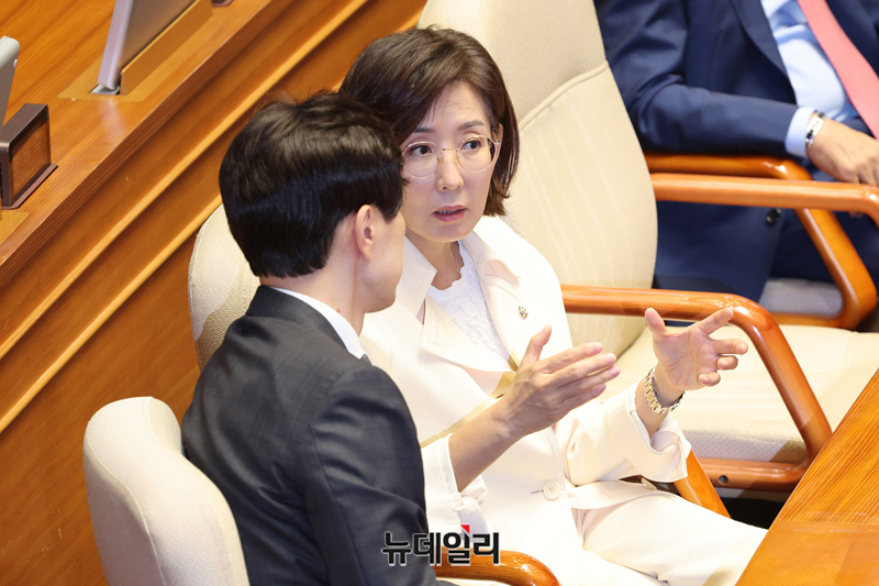 나경원 국민의힘 의원이 17일 국회에서 열린 본회의에서 박성훈 의원과 대화를 나누고 하고 있다.