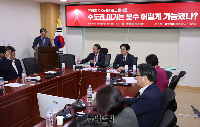 유정복·조정훈 토크콘서트 '수도권에서 이기는 보수, 어떻게 가능했나?'가 18일 오전 국회 의원회관에서 열린 가운데 유 시장과 조 의원이 발언을 하고 있다.