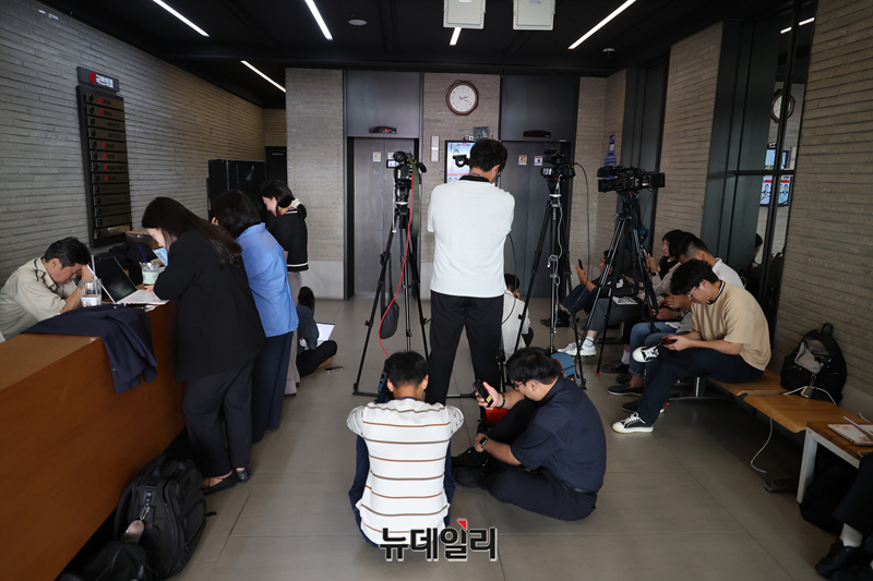 민중기 특별검사팀이 '건진법사 청탁 의혹'과 관련해 국민의힘 여의도 중앙당사 압수수색 영장을 집행한 18일 당사에 취재진이 대기하고 있다.