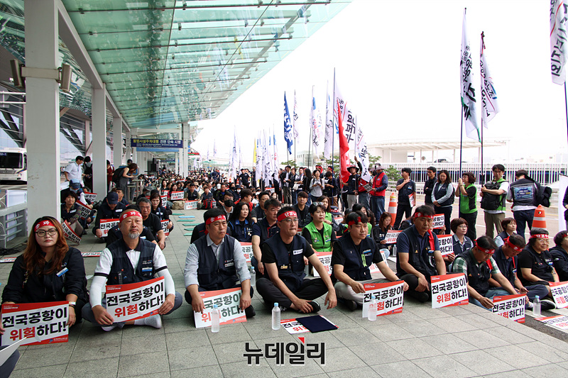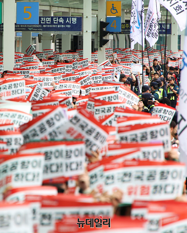 노조는 19일 인천국제공항 제2터미널에서 경고 파업을 시작으로 요구안이 받아들여지지 않을 시 추석 명절 전면 총파업을 통해 전국 공항을 멈추겠다고 예고했다. (인천=서성진 기자)