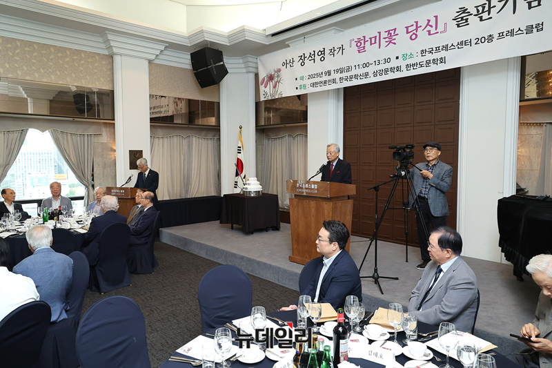 아산 장석영 작가가 19일 오전 서울 중구 한국프레스센터에서 열린 저서 '할미꽃 당신' 출판기념회에서 인사말을 하고 있다.