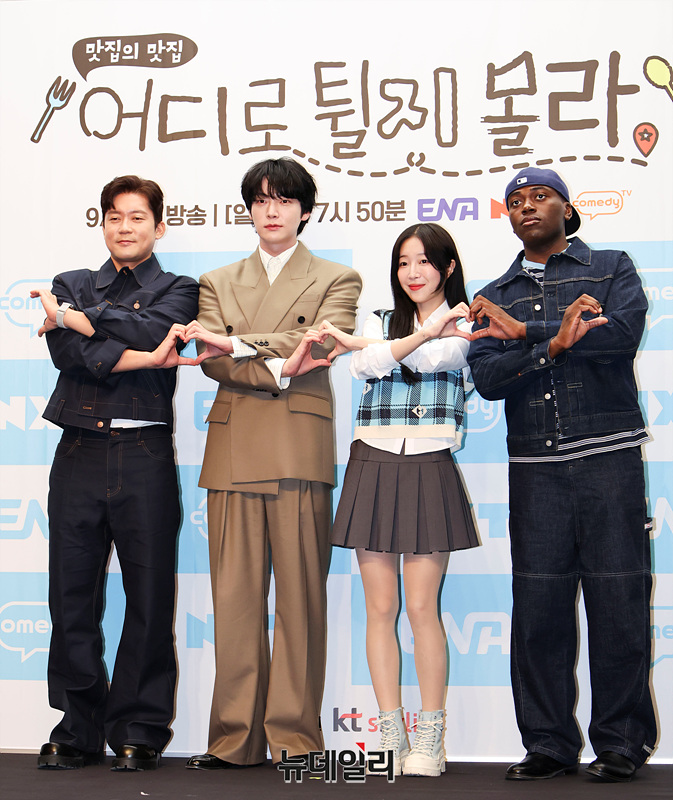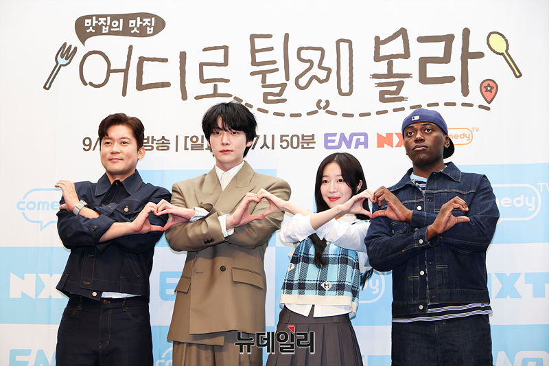 방송인 김대호, 안재현, 쯔양, 조나단이 19일 오후 서울 마포구 스탠포드호텔에서 열린 ENA, NXT, 코미디TV 공동제작 예능 프로그램 '어디로 튈지 몰라' 제작발표회에서 포즈를 취하고 있다.