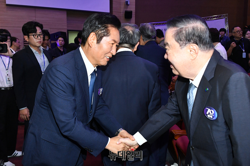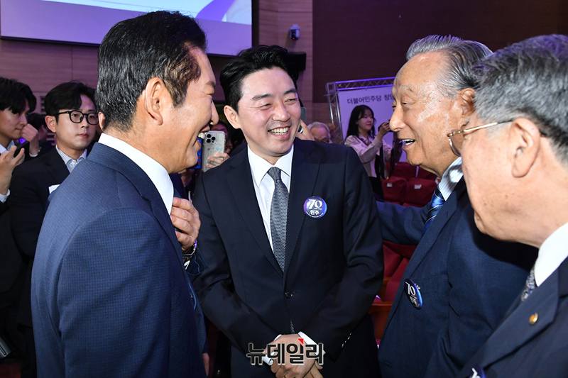 정청래 더불어민주당 대표가 19일 국회 의원회관에서 열린 창당 70주년 기념식 '국민과 함께, 당원과 함께 민주 70'에서 권노갑 ·김원기·김진표·문희상·이해찬·임채정 민주당 상임고문들과 인사를 나누고 있다.