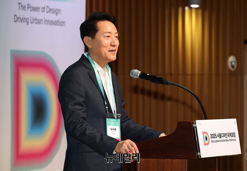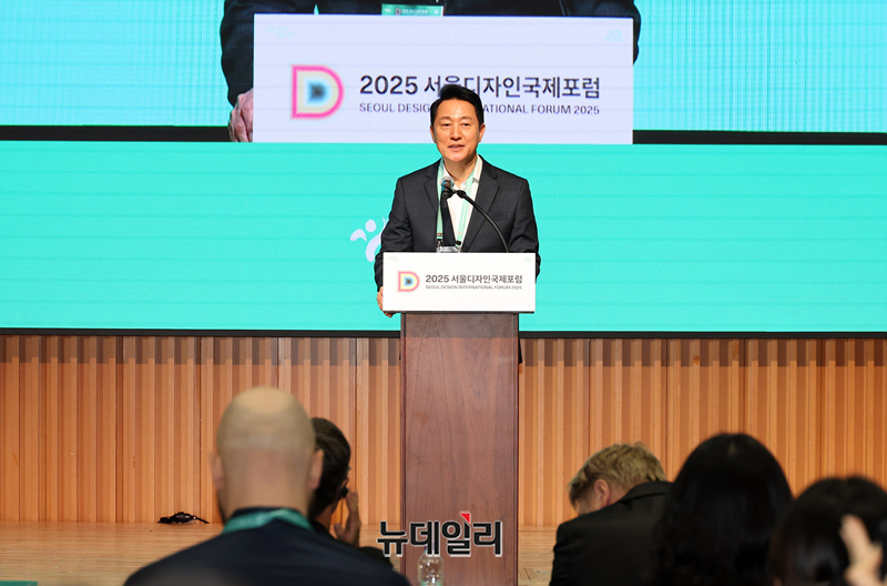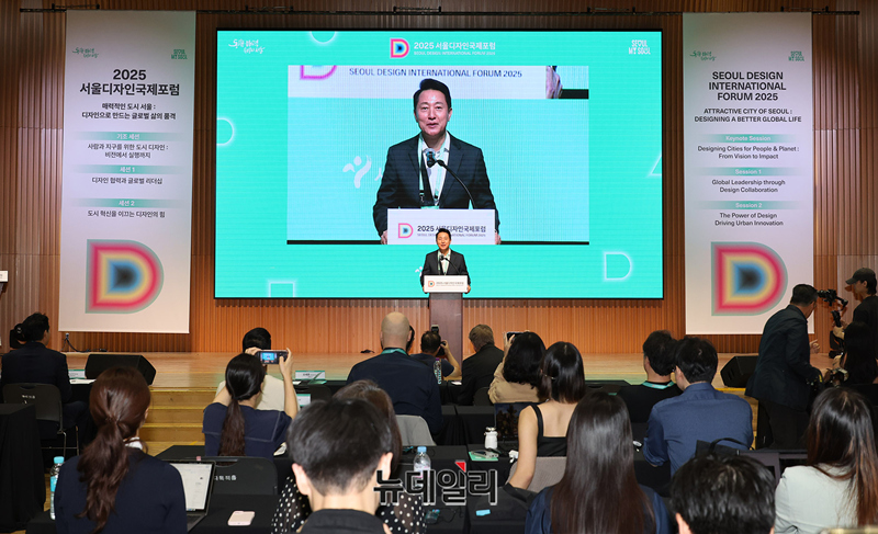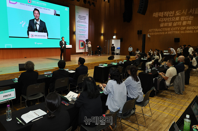 오세훈 서울시장이 19일 오후 서울시청 다목적홀에서 열린 '2025 서울디자인국제포럼'에서 환영사를 하고 있다. 포럼 기조연설은 헬레 소홀트 GEHL공동설립자 겸 CEO가 맡았다.