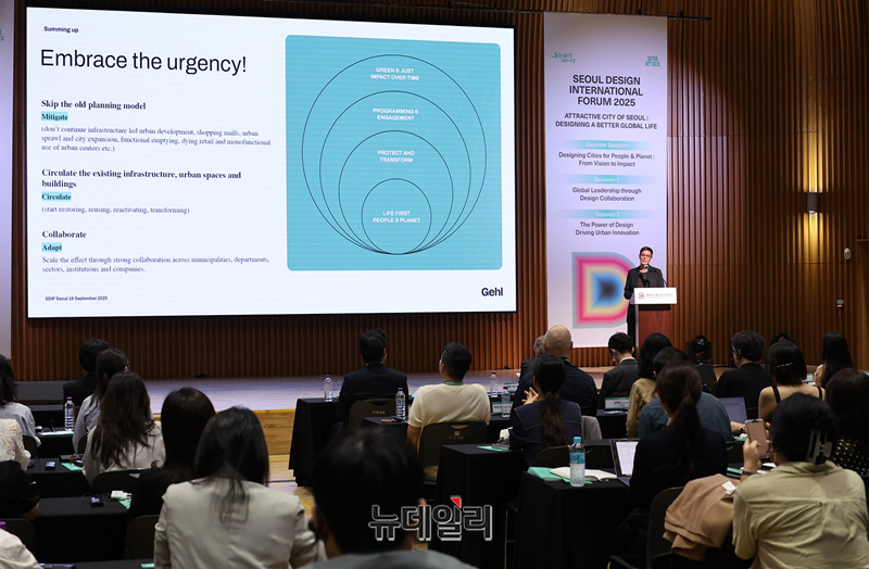 헬레 소홀트 GEHL 공동설립자 겸 CEO가 19일 오후 서울시청 다목적홀에서 열린 2025 서울디자인국제포럼에서 기조강연을 하고 있다.