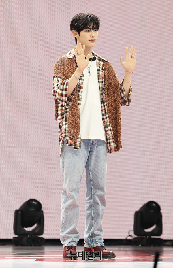 아이돌그룹 킥플립 민제가 22일 오전 서울 광진구 예스24 라이브홀에서 열린 미니 3집 'My First Flip(마이 퍼스트 플립)' 쇼케이스에서 포즈를 취하고 있다.