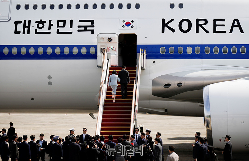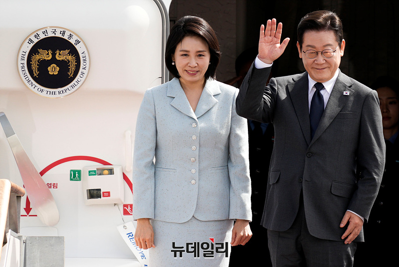 제 80차 유엔(UN) 총회 참석차 출국하는 이재명 대통령이 22일 오전 경기 성남시 서울공항에서 공군 1호기에 탑승하며 인사하고 있다. (경기 성남=서성진 기자)