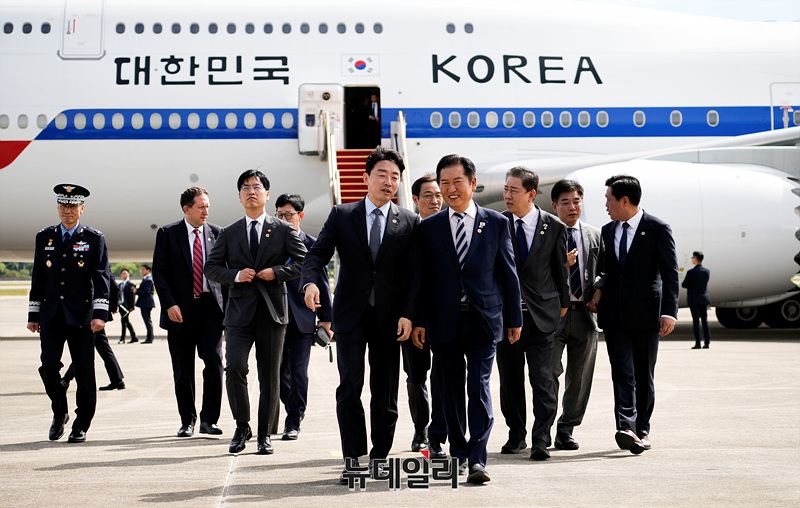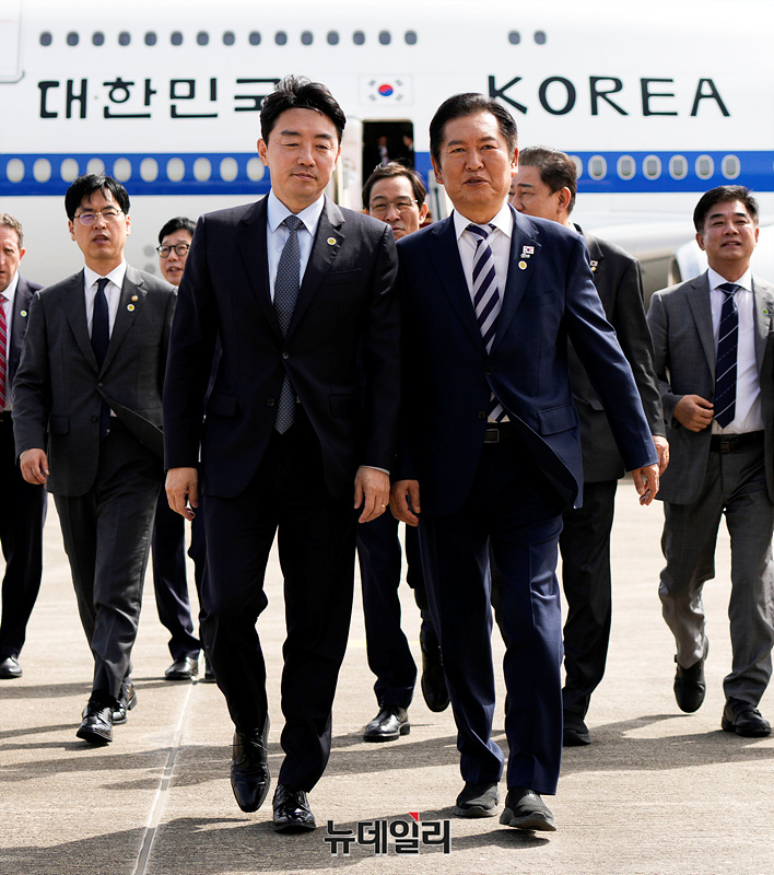 강훈식 대통령 비서실장과 정청래 더불어민주당 대표가 22일 오전 경기 성남시 서울공항에서 제 80차 유엔(UN) 총회 참석차 출국하는 이재명 대통령을 환송을 마치고 이동하고 있다. (경기 성남=서성진 기자)