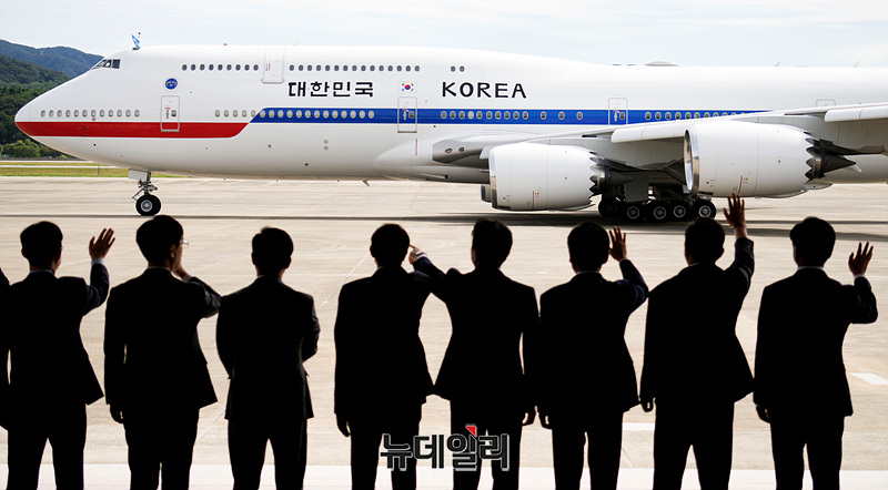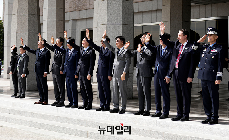 강훈식 대통령 비서실장과 정청래 더불어민주당 대표, 김병기 원내대표 등 참석자들이 22일 오전 경기 성남시 서울공항에서 제 80차 유엔(UN) 총회 참석차 출국하는 이재명 대통령을 향해 손을 흔들고 있다. (경기 성남=서성진 기자)