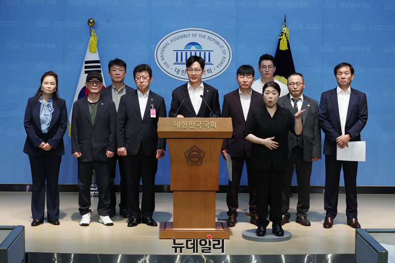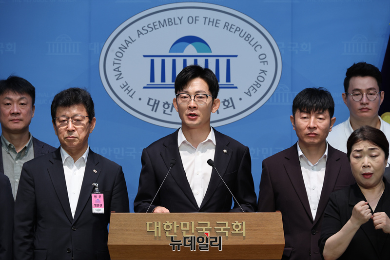 박충권 국민의힘 의원이 22일 오전 국회 소통관에서 '탈북민 명칭 변경 반대기자회견'을 갖고 있다.