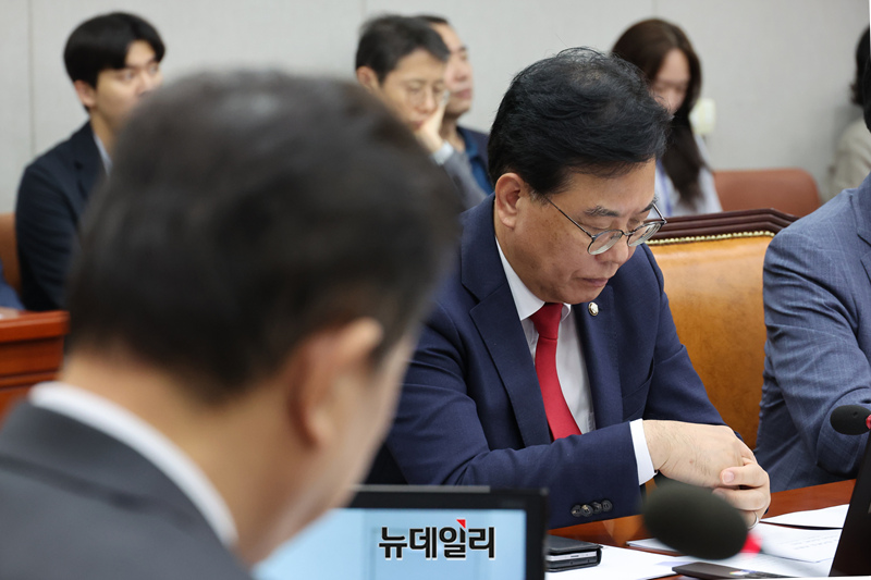 송언석 국민의힘 원내대표가 22일 오후 국회에서 열린 국회운영위원회 전체회의에 참석해 생각에 잠겨 있다.