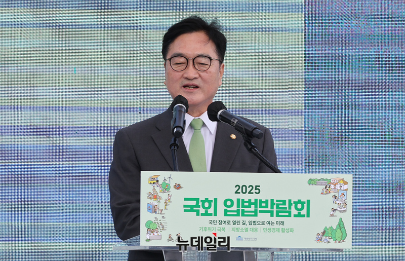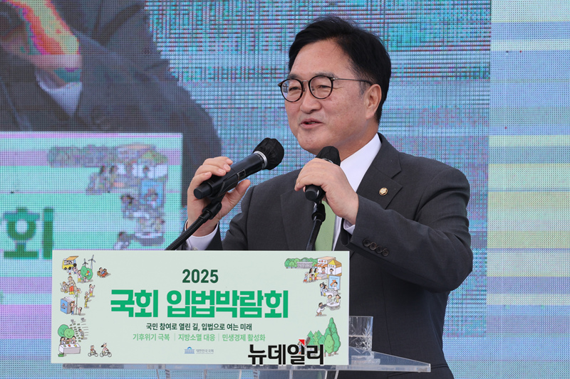 우원식 국회의장이 24일 국회 잔디광장에서 열린 '국민 참여로 열린 길, 입법으로 여는 미래' 입법박람회 개회사를 하고 있다.