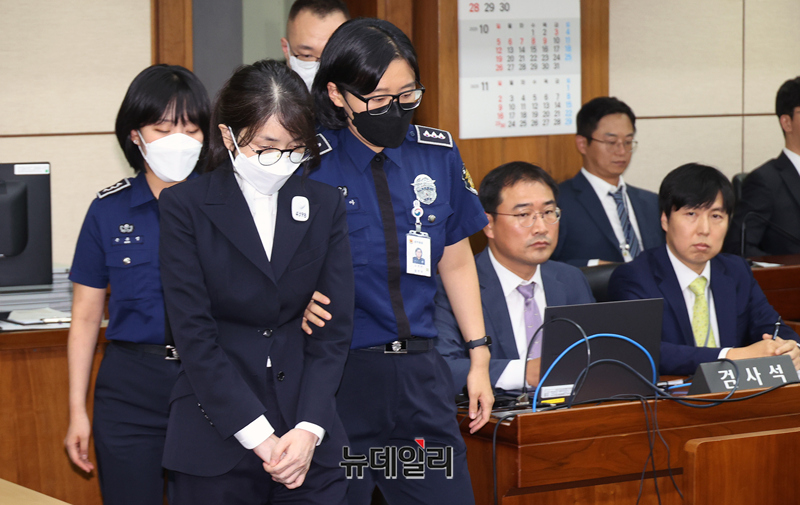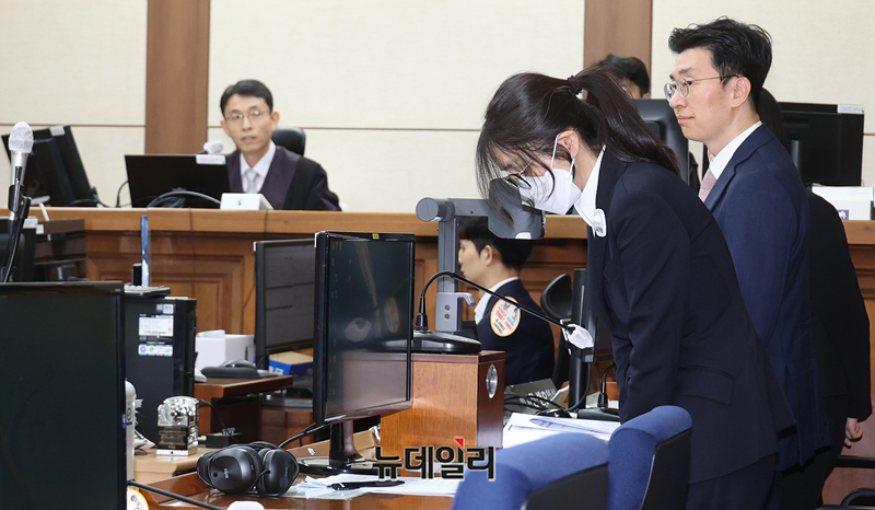 도이치모터스 주가조작과 명태균 공천개입, 통일교 청탁·뇌물 수수 의혹 혐의 등으로 구속기소 된 김건희 여사가 24일 오후 서울 서초구 서울중앙지방법원에서 열린 첫 재판에 출석하고 있다. (사진=공동취재단)