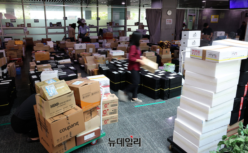 추석 연휴를 일주일 앞둔 25일 오전 국회 의원회관에 명절 선물 및 택배들이 1층 로비 한쪽을 가득 메우고 있다.