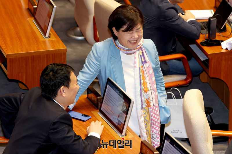 김용민 법사위 더불어민주당 간사와 서영교 의원이 25일 국회에서 열린 본회의에서 대화를 나누고 있다.