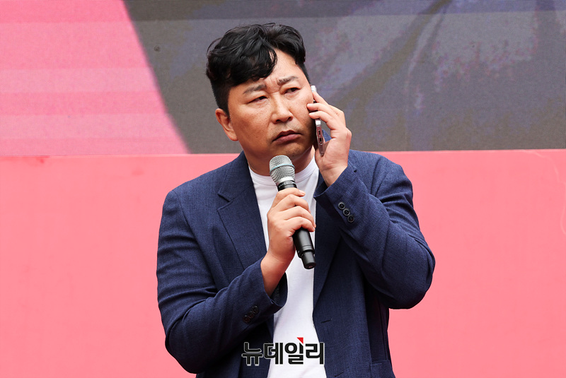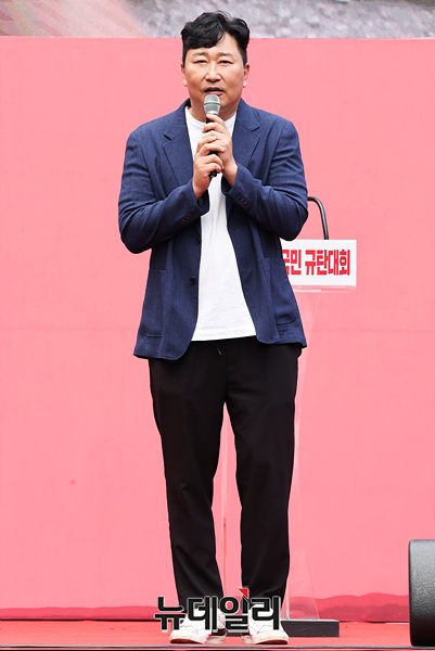 개그맨 최국이 28일 오후 서울 시청역에서 열린 사법파괴 입법독재 국민 규탄대회에서 규탄사를 하고 있다.