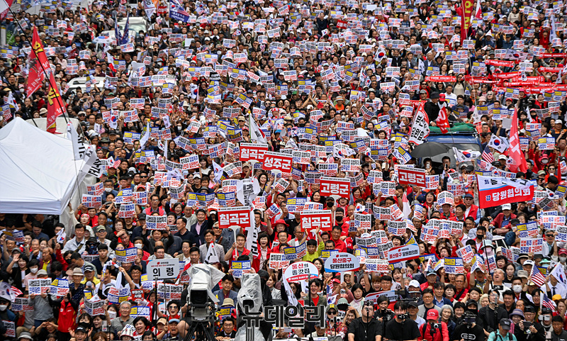 사법파괴 입법독재 국민 규탄대회가 열린 28일 오후 서울 시청역 앞 세종대로가 지지자들로 가득 차 있다.
