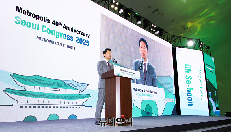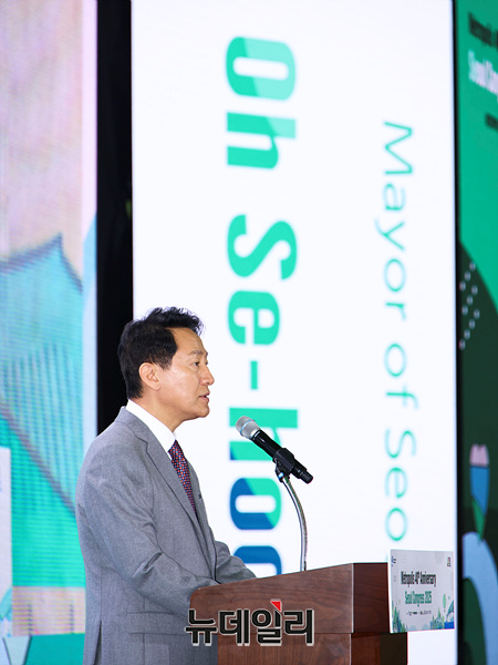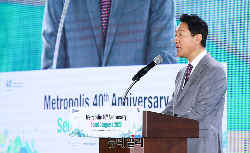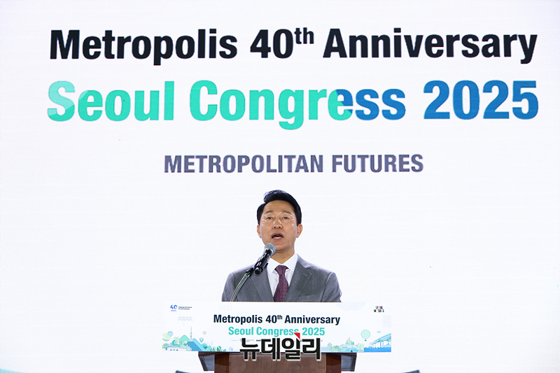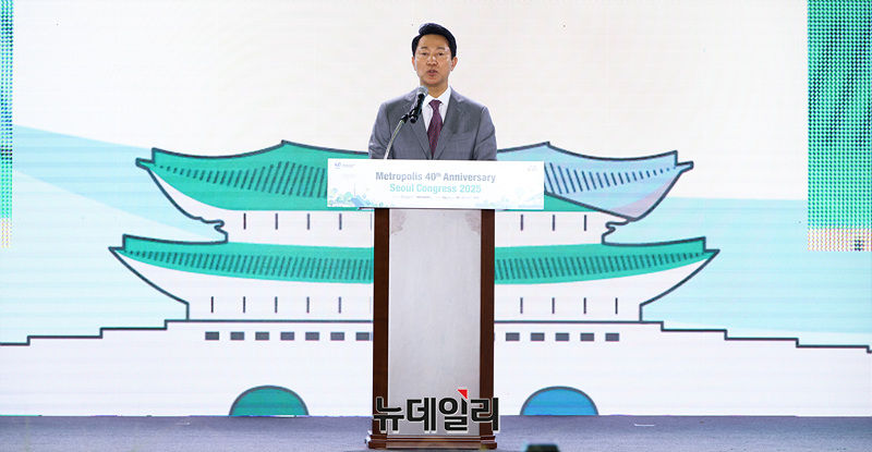 오세훈 서울시장이 29일 오후 서울 중구 동대문디자인플라자에서 열린 2025 세계대도시협의회 창립 40주년 기념 서울총회 개회식에서 개회사를 하고 있다.