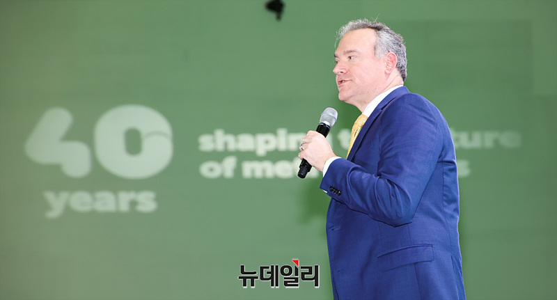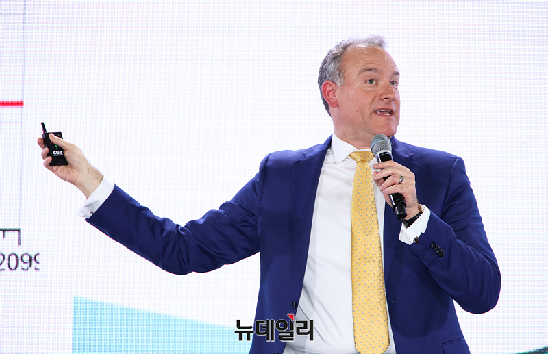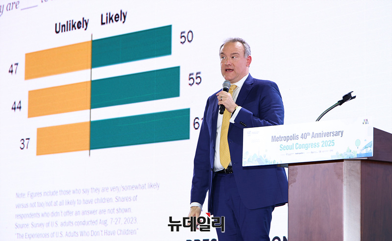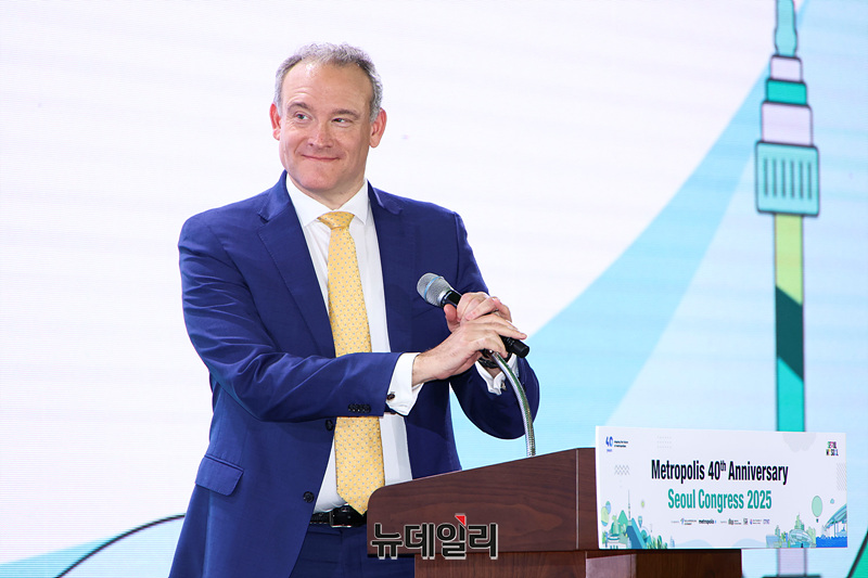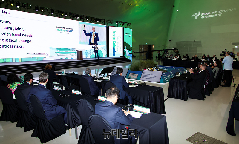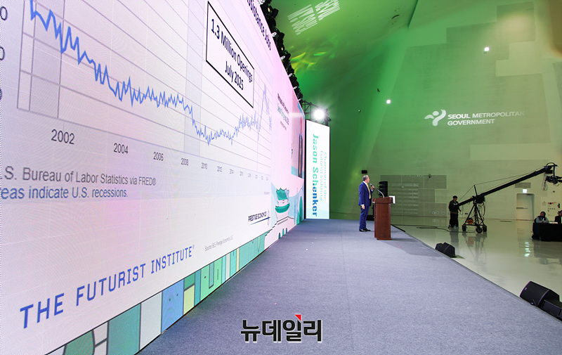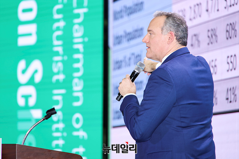 제이슨 솅커 퓨처리스트 인스티튜트 의장이 29일 오후 서울 중구 동대문디자인플라자에서 열린 2025 세계대도시협의회 창립 40주년 기념 서울총회 개회식에서 기조연설을 하고 있다.