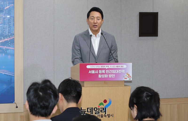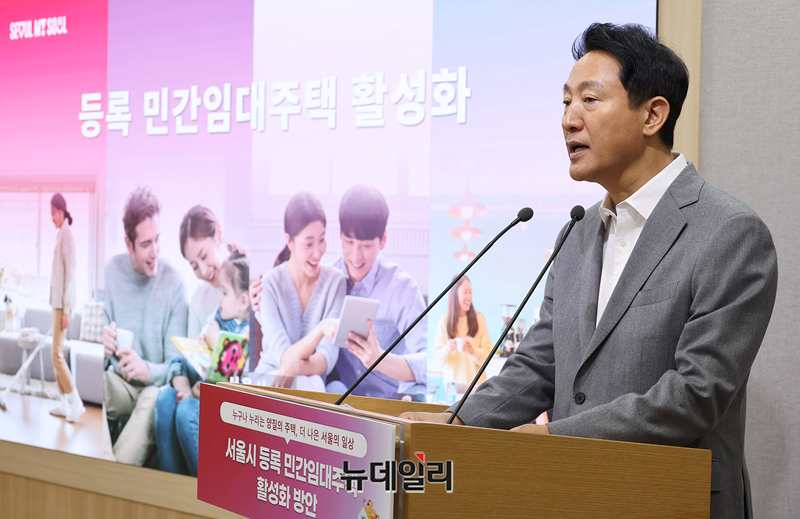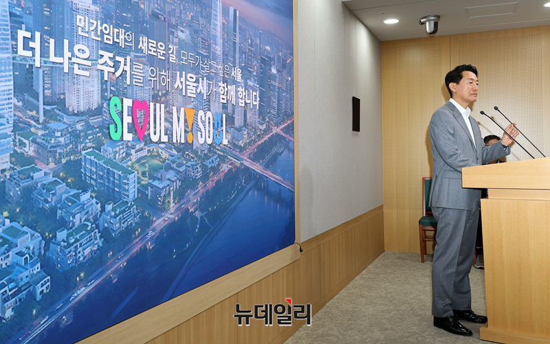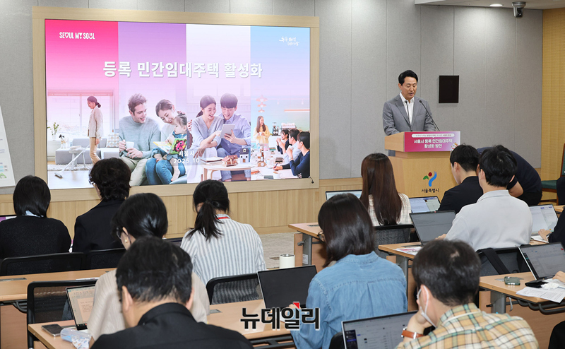오세훈 서울시장이 1일 오전 서울시청에서 '등록 민간임대주택 활성화' 관련 브리핑을 갖고 민간임대주택의 공급 절벽을 해소하고자 건축 규제를 완화하고 금융 지원을 확대하는 내용을 발표하고 있다.