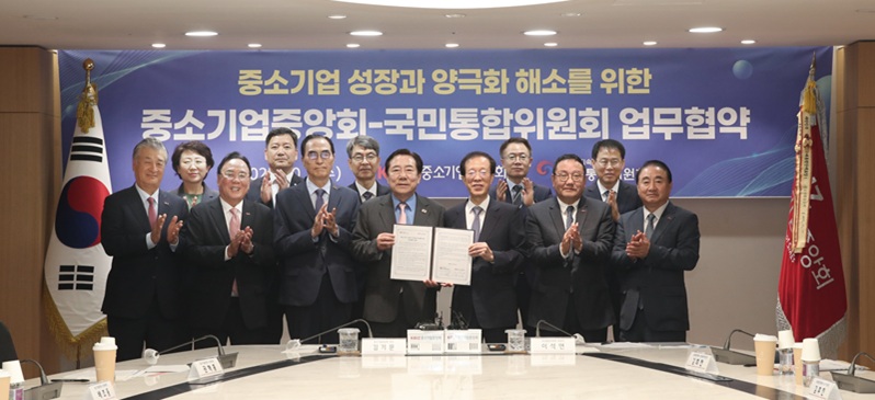 양 기관은 1일 서울 여의도 중기중앙회 리더스룸에서 '중소기업 성장과 양극화 해소를 위한 공동협력 협약(△정책 발굴을 위한 소통 기반 마련 △정책제안 권고 및 이행점검 △연구조사 협력 △인식개선 홍보·캠페인)'을 체결하고, 기업 간 격차 완화를 통한 실질적인 국민통합을 위해 힘을 모으기로 했다.