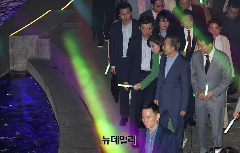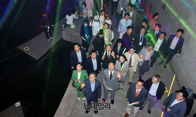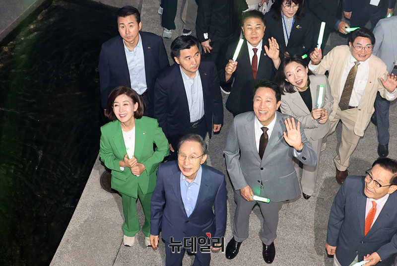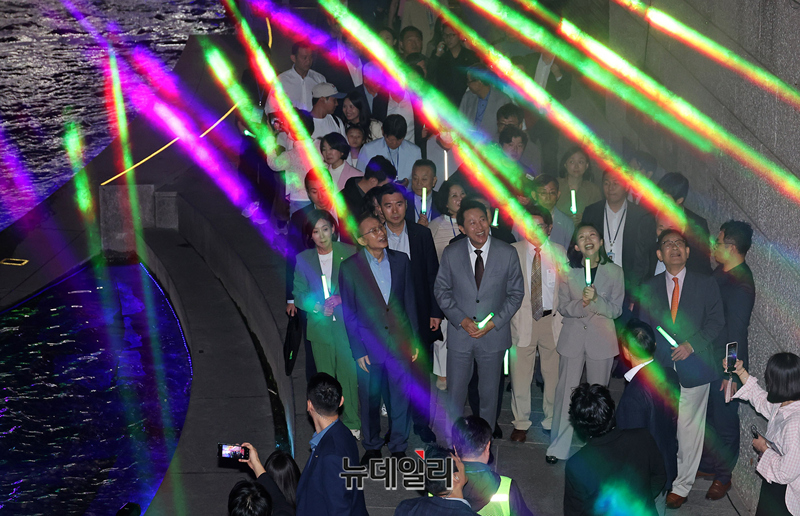 이명박 전 대통령, 오세훈 서울시장, 최호정 서울시의회 의장, 나경원 국민의힘 의원 등이 1일 오후 서울 청계광장에서 열린 청계천복원 20주년 행사를 마치고 청계천을 산책하며 시민들에게 인사를 하고 있다.