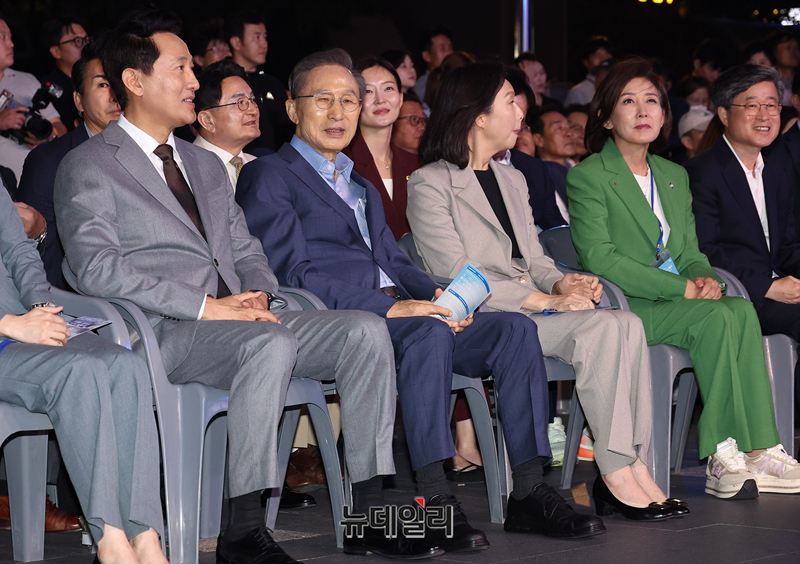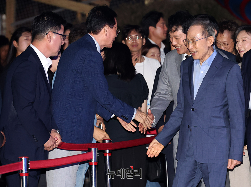 이명박 전 대통령, 오세훈 서울시장 등이 1일 오후 서울 청계광장에서 열린 청계천복원 20주년 기념식에 입장하며 내빈들과 악수를 하고 있다.
