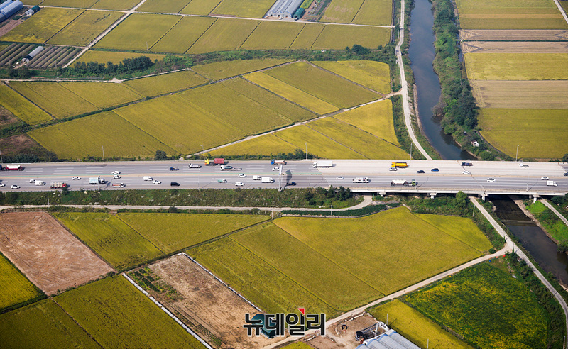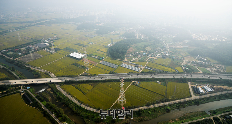 추석 연휴를 하루 앞둔 2일 오전 서울경찰청 소속 참수리 헬기에서 바라본 경기 용인시 논이 황금빛으로 물들어 있다. (항공촬영협조=서울경찰청 항공대 김두수 경감, 심동국 경위)