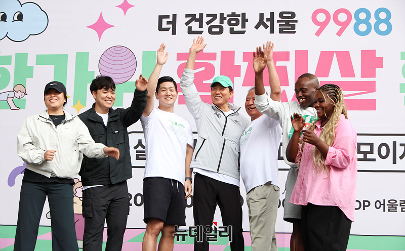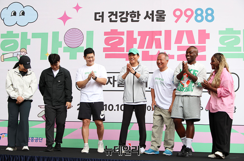 오세훈 서울시장을 비롯한 참석자이 10일 오전 서울 중구 동대문디자인플라자에서 열린 '더 건강한 서울9988 한가위 확.찐.살. 확빼기 체력 회복 챌린지' 행사에서 기념촬영을 하고 있다.
