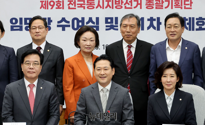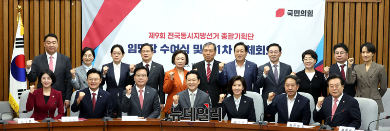 장동혁 국민의힘 대표와 참석자들이 10일 오전 국회에서 열린 '지방선거총괄기획단 임명장 수여식 및 제1차 전체회의'에서 기념촬영을 하고 있다.