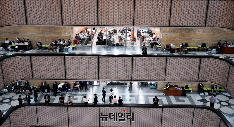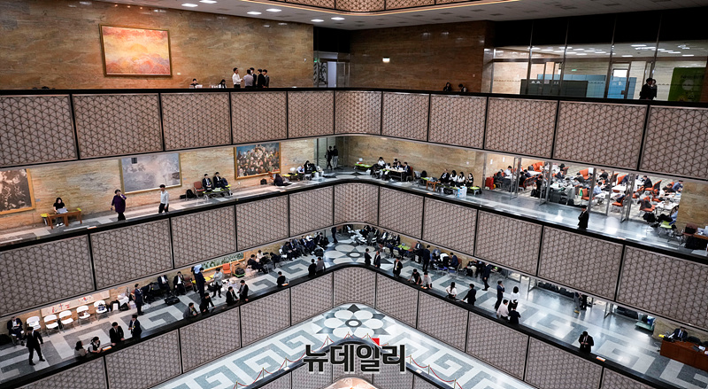이재명 정부 첫 국정감사가 시작된 13일 오전 국회에서 피감기관 관계자들이 분주히 움직이고 있다.