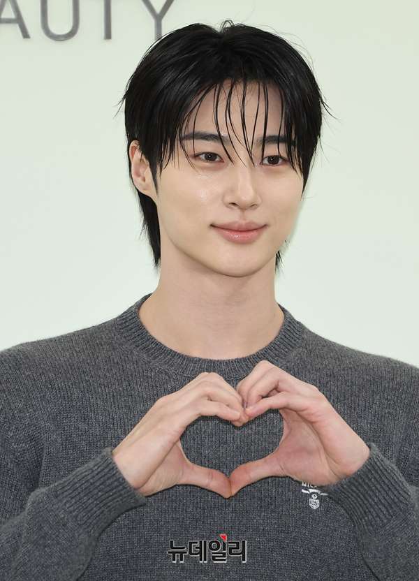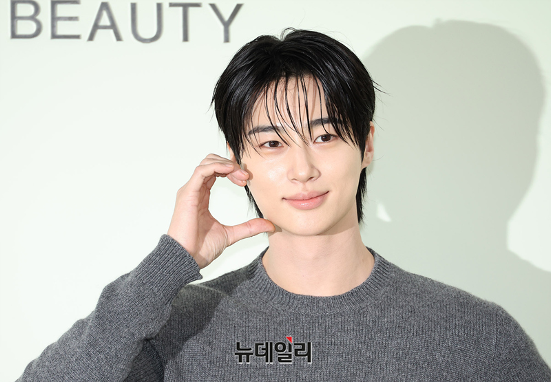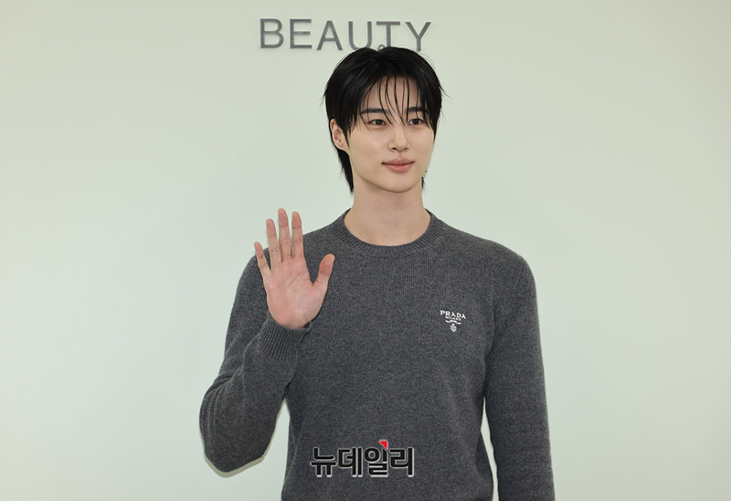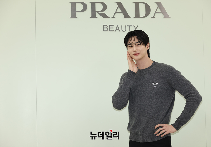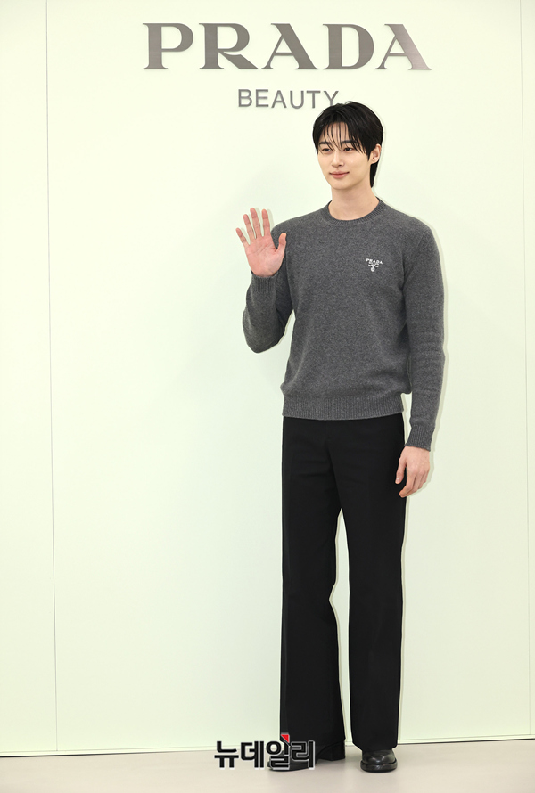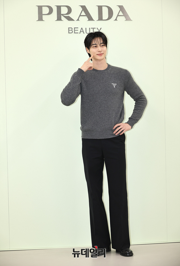배우 변우석이 13일 오후 서울 성동구 성수동에서 열린 '프라다 뷰티 바나나 립 밤' 국내 출시 행사에서 포즈를 취하고 있다.