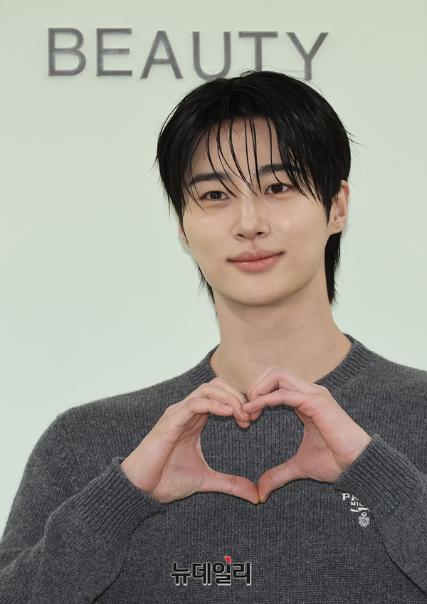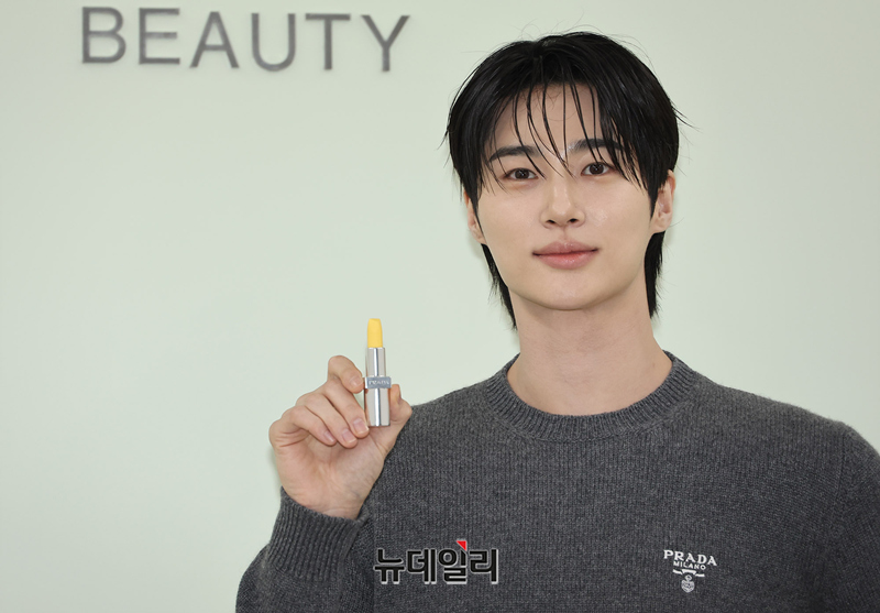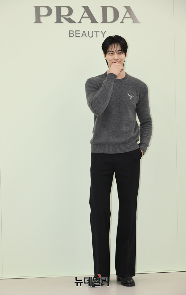 배우 변우석이 13일 오후 서울 성동구 성수동에서 열린 '프라다 뷰티 바나나 립 밤' 국내 출시 행사에서 포즈를 취하고 있다.