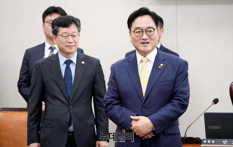 우원식 국회의장이 14일 오전 국회에서 열린 기후에너지환경위원회 국정감사에서 격려인사를 하고 있다.