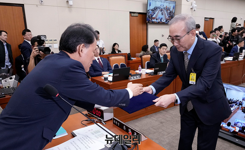 김영섭 KT 대표이사가 14일 오후 국회에서 열린 정무위원회 국정감사에서 증인선서를 하고 있다.