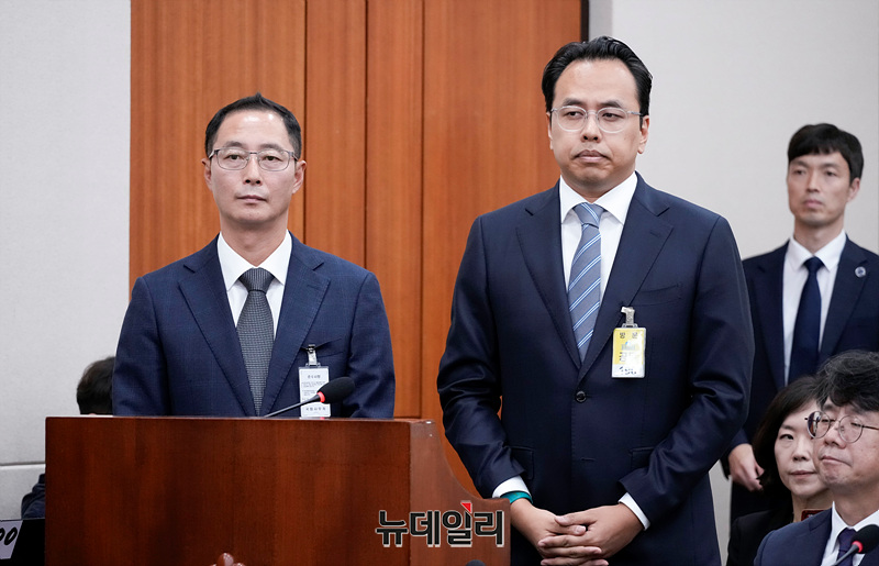 [포토] 나란히 증언대 선 김명규 쿠팡 이츠 대표와 김범석 우아한형제들 대표이사