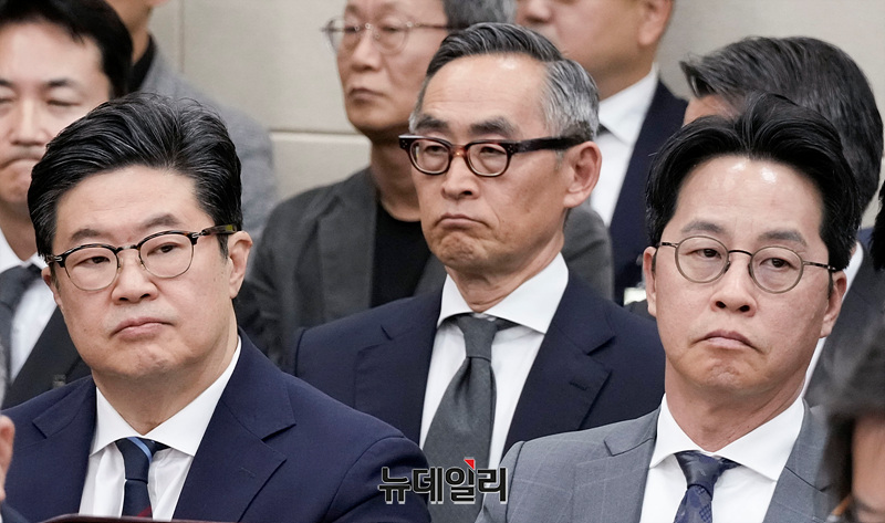 김병주 MBK파트너스 회장(왼쪽), 윤종하 부회장(가운데), 조좌진 롯데카드 대표가 14일 오후 국회에서 열린 정무위원회 국정감사에 출석해 자리하고 있다.