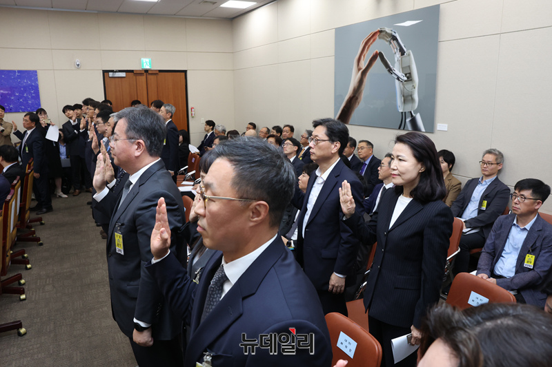 이진숙 전 방송통신위원장이 14일 국회에서 열린 과학기술정보방송통신위원회 국정감사에 증인으로 출석해 선서를 하고 있다.