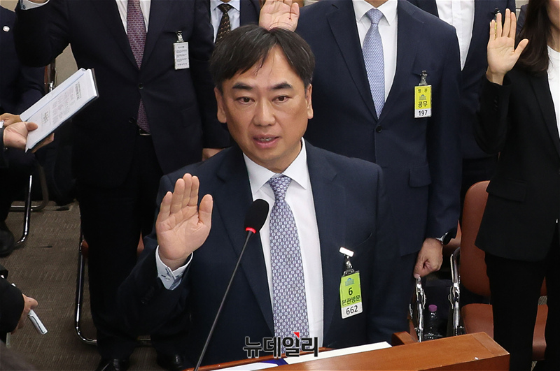 이정환 울산방송사장 등 일반 증인들이 14일 오후 국회에서 열린 과학기술정보방송통신위원회 방송통신위원회 등에 대한 국정감사에 출석해 증인 선서를 하고 있다.