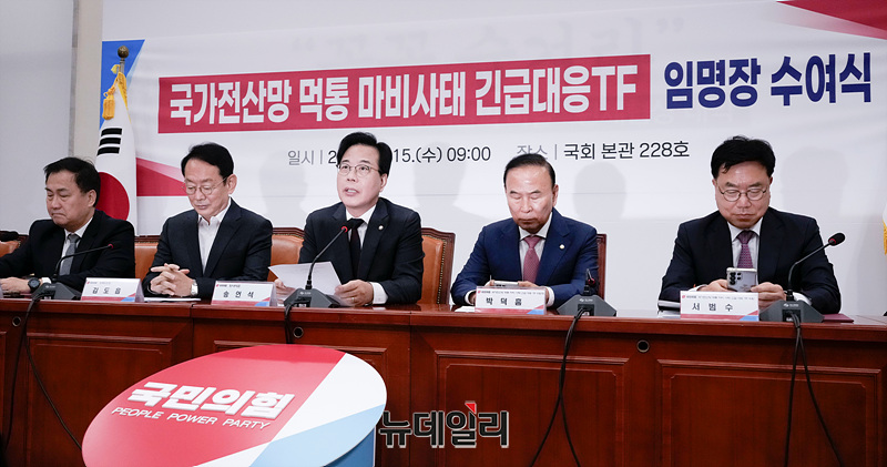 송언석 국민의힘 원내대표가 15일 오전 국회에서 열린 국가전산망 먹통 마비 사태 긴급 대응 TF 임명장 수여식에서 인사말을 하고 있다.