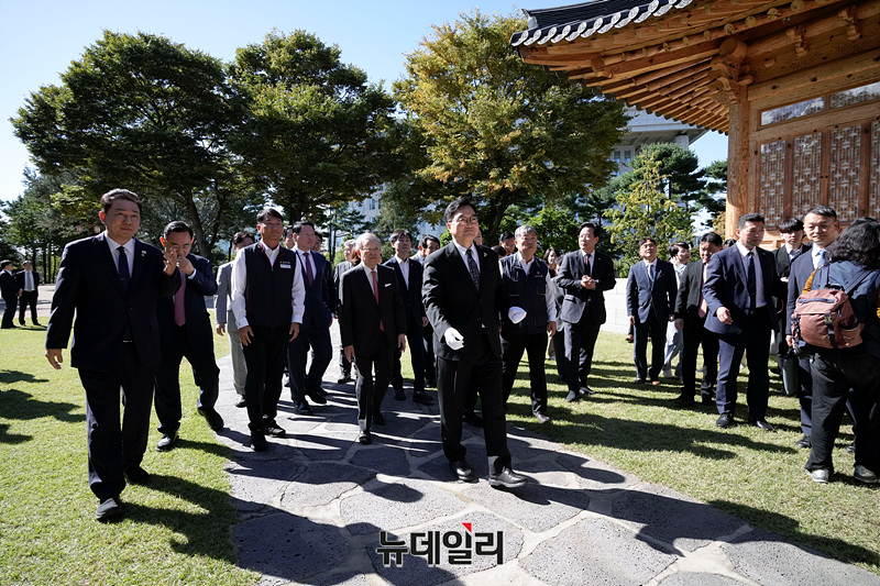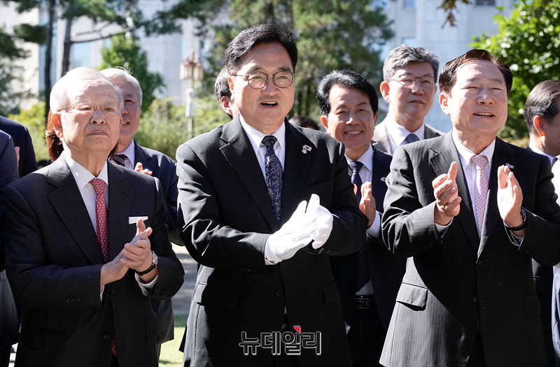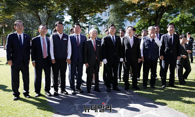 우원식 국회의장, 양경수 민주노총 위원장, 최태원 대한상공회의소 회장, 김동명 한국노총 위원장, 손경식 한국경영자총협회 회장, 김기문 중소기업중앙회 회장이 15일 오전 국회에서 열린 사회적 대화 공동선언식 기념식수를 마치고 사랑재로 이동하고 있다.