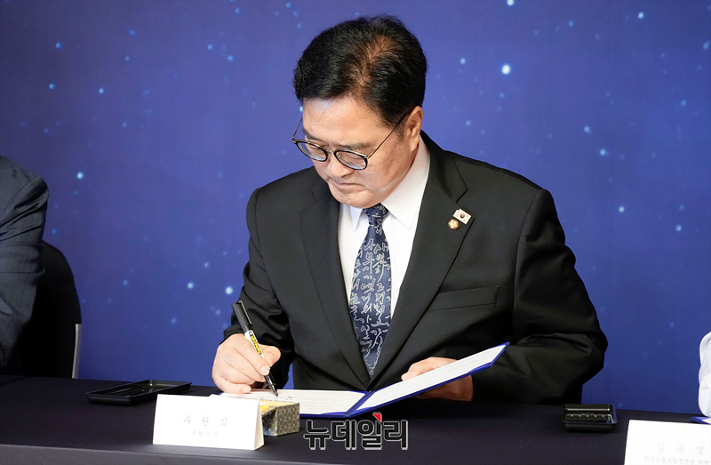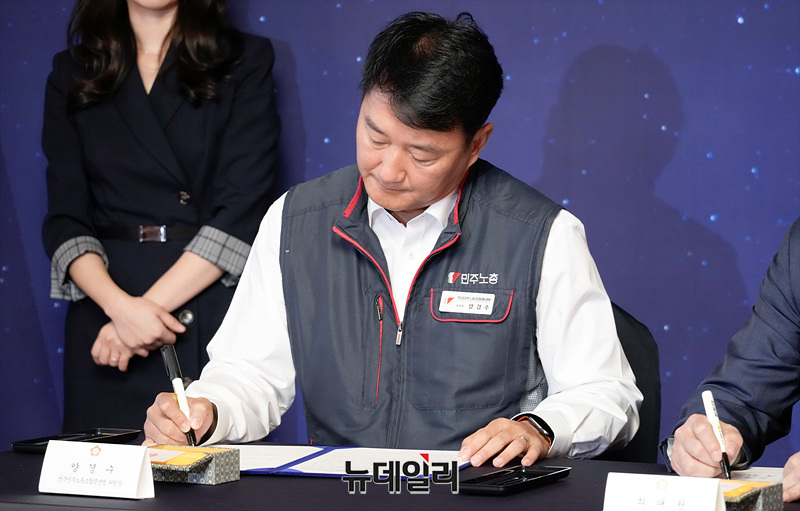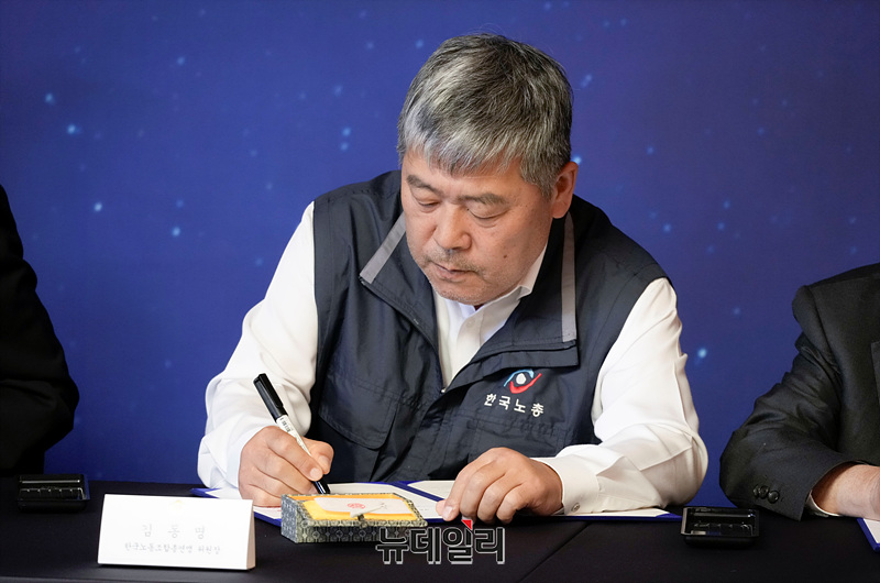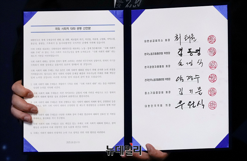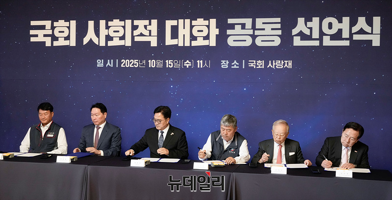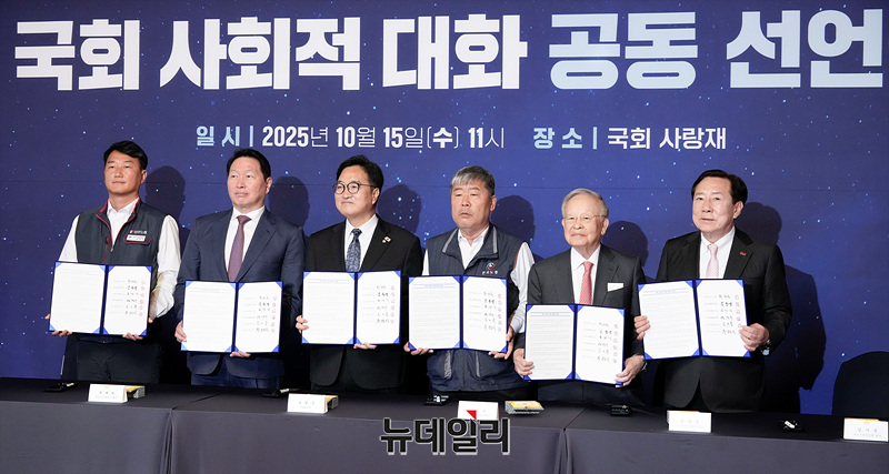 우원식 국회의장, 양경수 민주노총 위원장, 최태원 대한상공회의소 회장, 김동명 한국노총 위원장, 손경식 한국경영자총협회 회장, 김기문 중소기업중앙회 회장이 15일 오전 국회에서 열린 사회적 대화 공동선언식에서 서명을 마친 뒤 기념 촬영하고 있다.