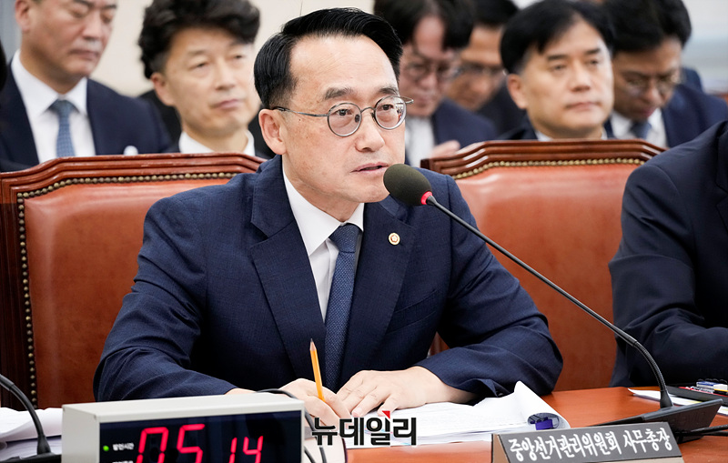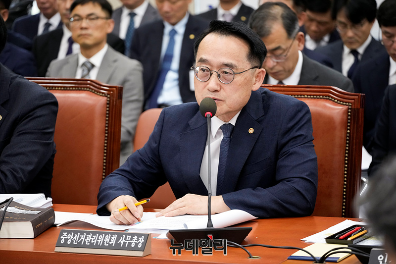 허철훈 선거관리위원회 사무총장이 15일 오후 국회에서 열린 행정안전위원회 국정감사에서 의원들의 질의에 답하고 있다.