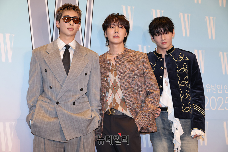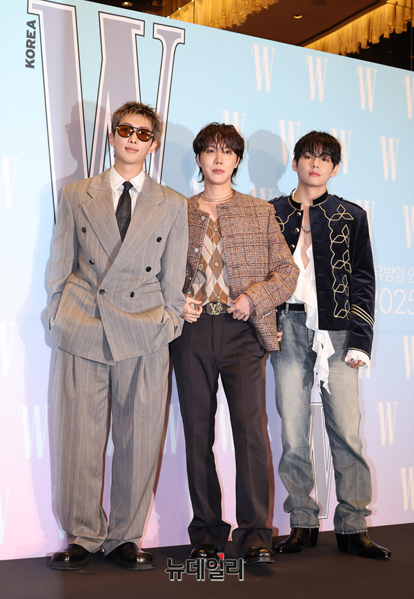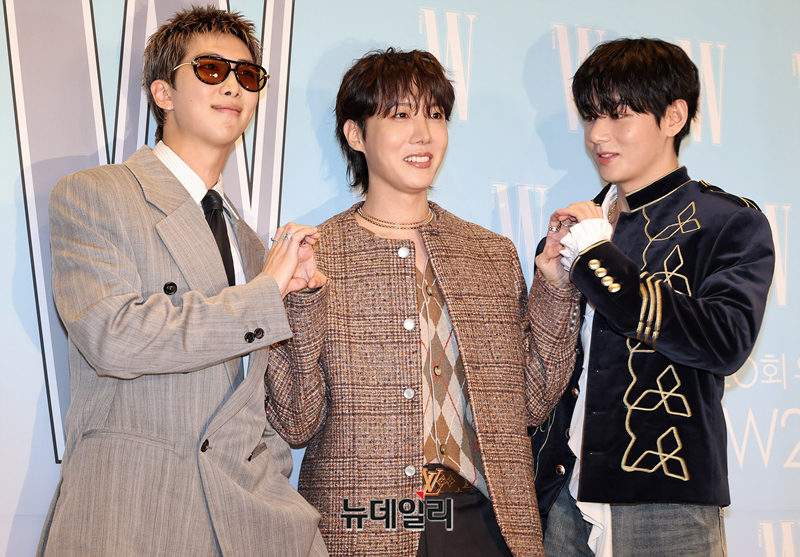 BTS RM, 제이홉, 뷔가 15일 오후 서울 종로구 포시즌스 호텔에서 열린 제20회 W Korea 유방암 인식 향상 캠페인 자선 행사에 참석해 포즈를 취하고 있다.