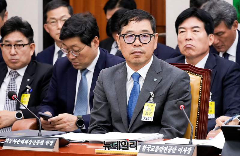 하대성 자동차손해배상진흥원 원장이 16일 오전 국회에서 열린 국토교통위원회 국정감사에 출석해 자리하고 있다.